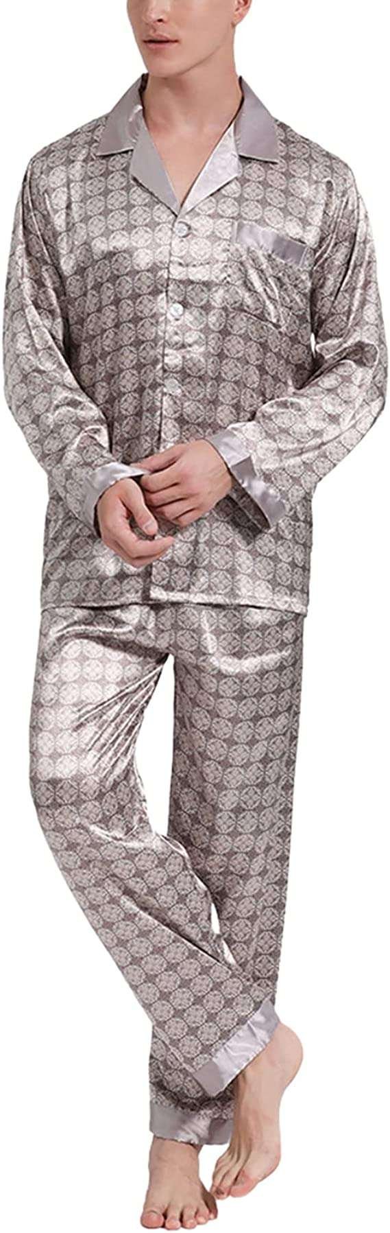 Men Pyjamas Set Satin Pyjama Printe Silk Nightwear Sleepwear Button Down Two Piece PJ