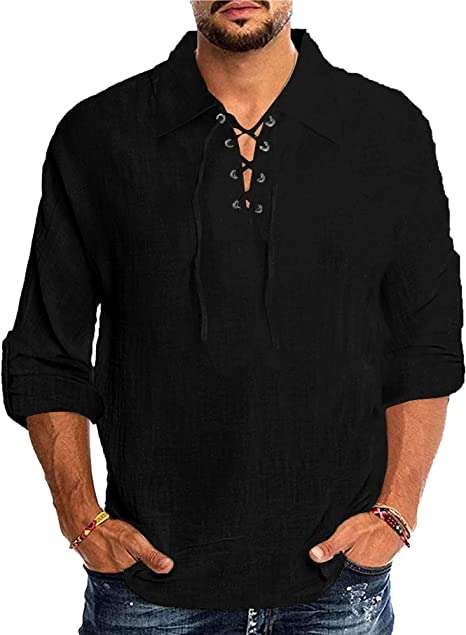 Men’s Fashion V-Neck Cotton Linen Lace up Shirts Grandad Collar Beach Yoga Top