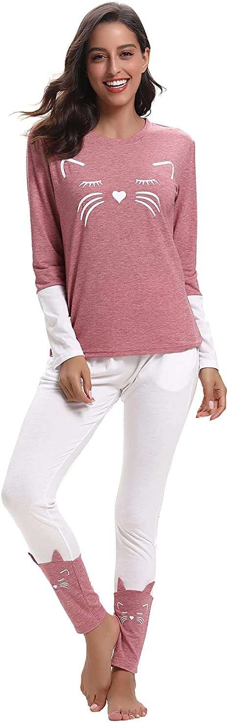 Cute Cat Womens Nightwear: The lounge wear sets for women uk features spicing design and with cute cat pattern printed in top front and the bottom legs, looks cute and young.