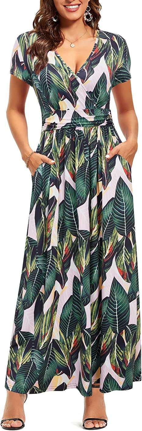 OUGES Women’s Maxi Dress Casual V Neck Short/Long Sleeve Floral Ladies Wrap Long Dress with Pockets
