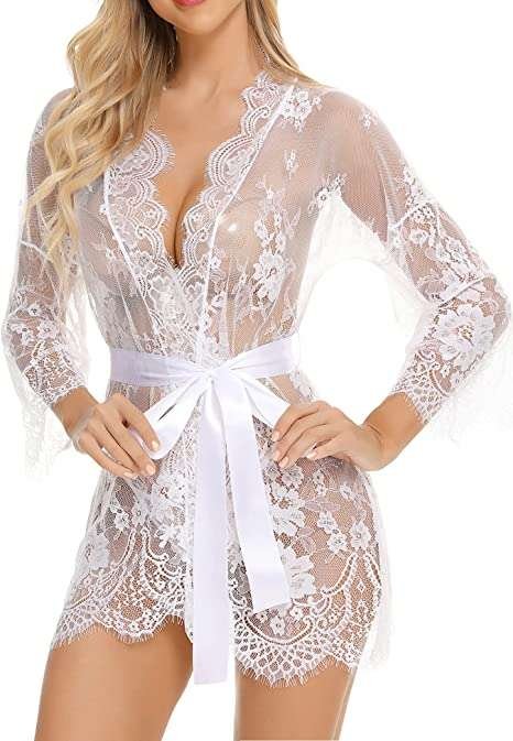 STYLE:Women’s lace kimono robe transparent sheer robe babydoll underwear nightdress , soft eyelash lace fabric, scalloped edge trim, and satin tie sash
